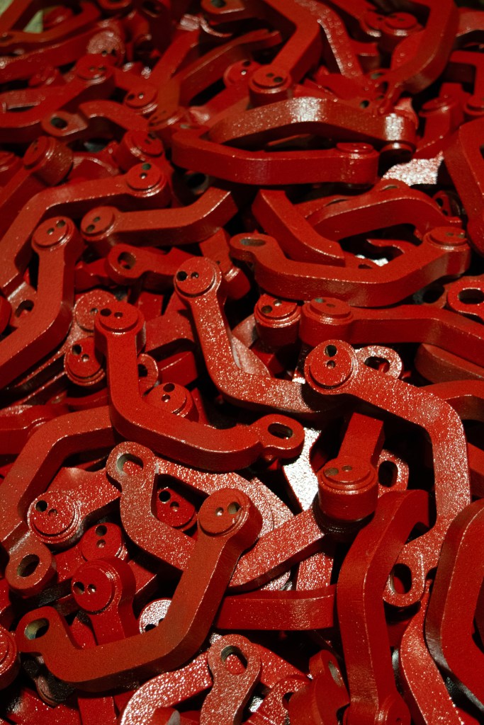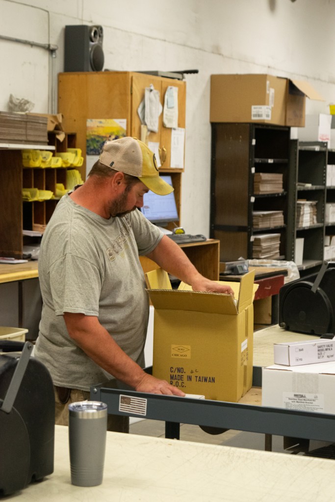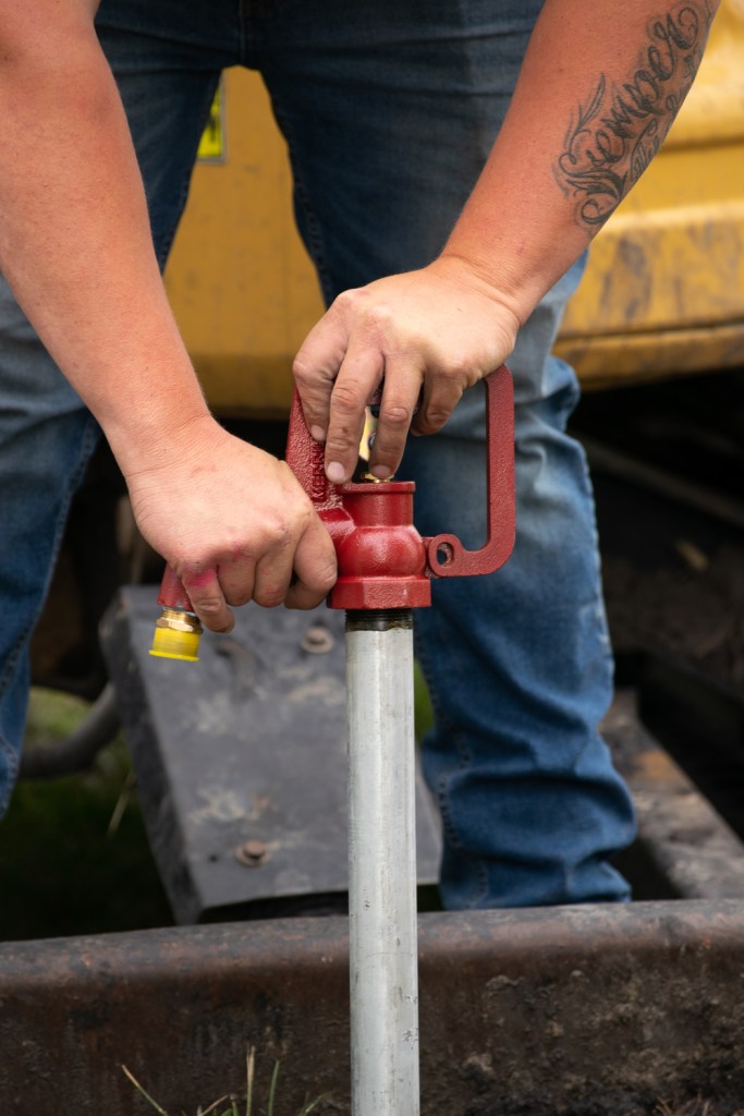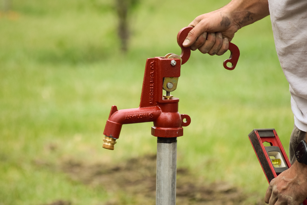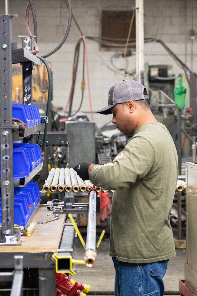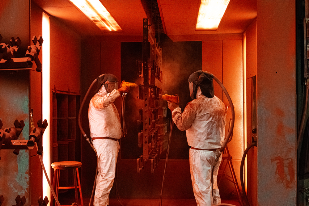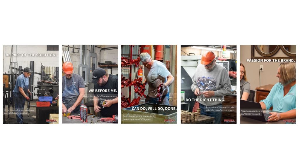 This section highlights on-site photography of Merrill hydrant installations, as well as behind-the-scenes images of powder coating and the production process. These photos were used to showcase both the craftsmanship and industrial process behind their products.