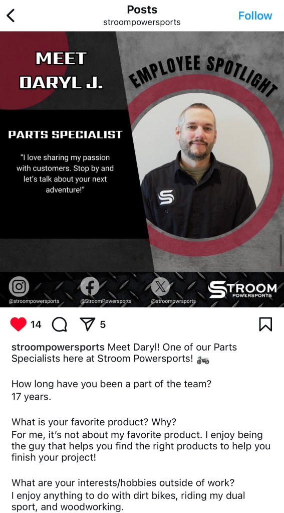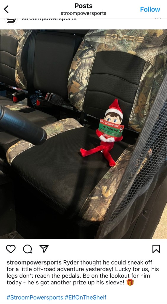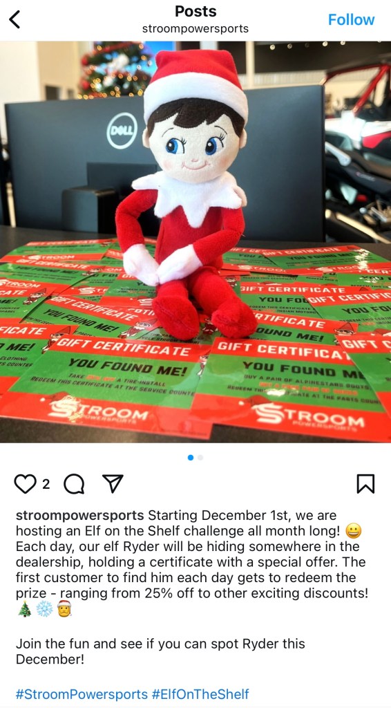 While managing Stroom Powersports’ social media, I created content that connected with their audience and showcased the community around their brand. This included a seasonal Elf on the Shelf campaign, custom graphics for promotions, employee shoutouts, and customer features highlighting new bike owners.